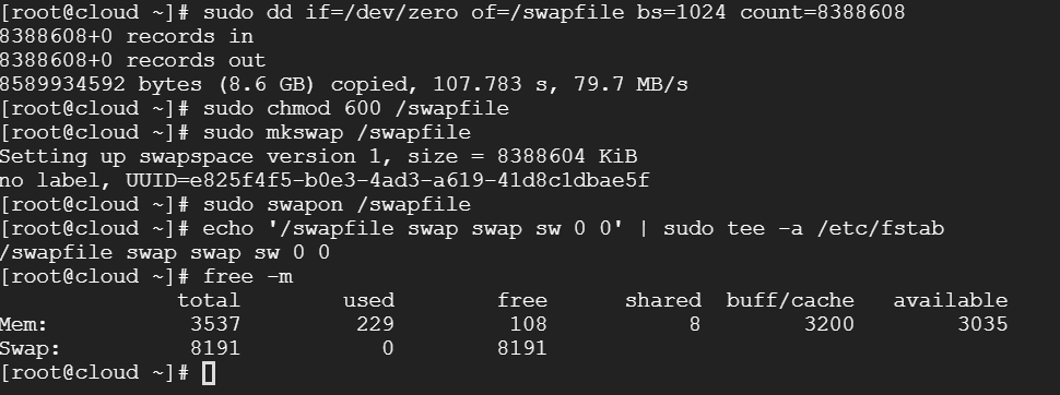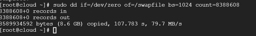 sudo dd if=/dev/zero of=/swapfile bs=1024 count=8388608