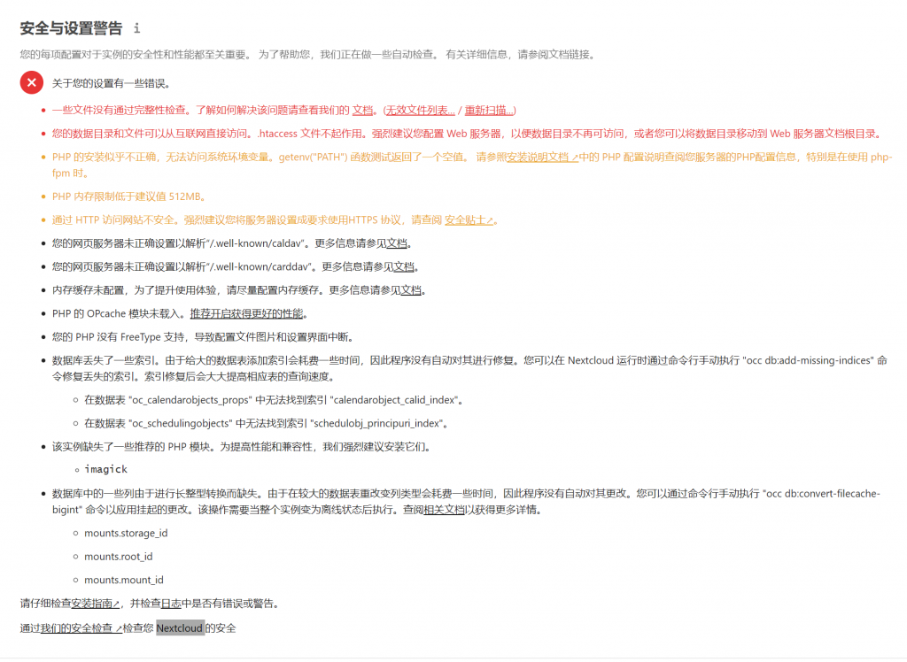 网盘在服务器上安装后,查看概览后,会出一堆的安全与设置警告,又是一个大坑!,Google上搜了一下,关于nextcloud的内容不是很多!