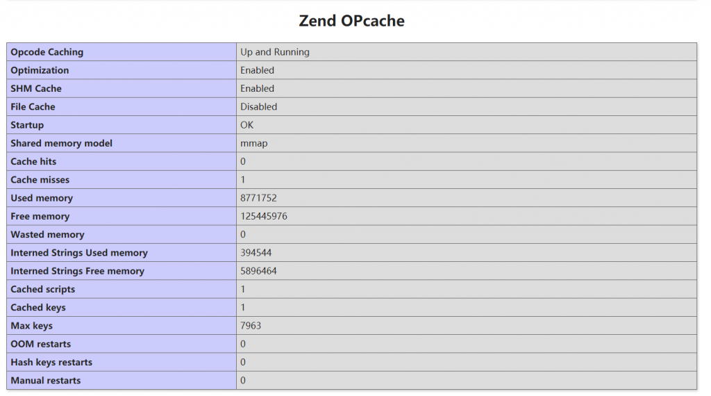 zend_extension=opcache.so opcache.enable=1 opcache.interned_strings_buffer=8 opcache.max_accelerated_files=10000 opcache.memory_consumption=128 opcache.save_comments=1 opcache.revalidate_freq=1 opcache.optimization_level=1 opcache.force_restart_timeout=3600