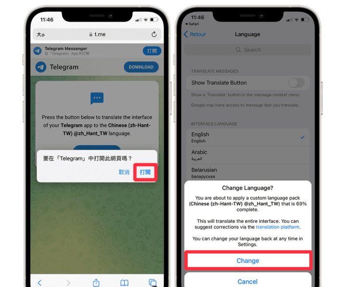 点击Telegram 中文化连结后,iPhone 用户请在跳出来小视窗上点选打开,然后按一下Change,这样就将iOS 版Telegram 改中文。