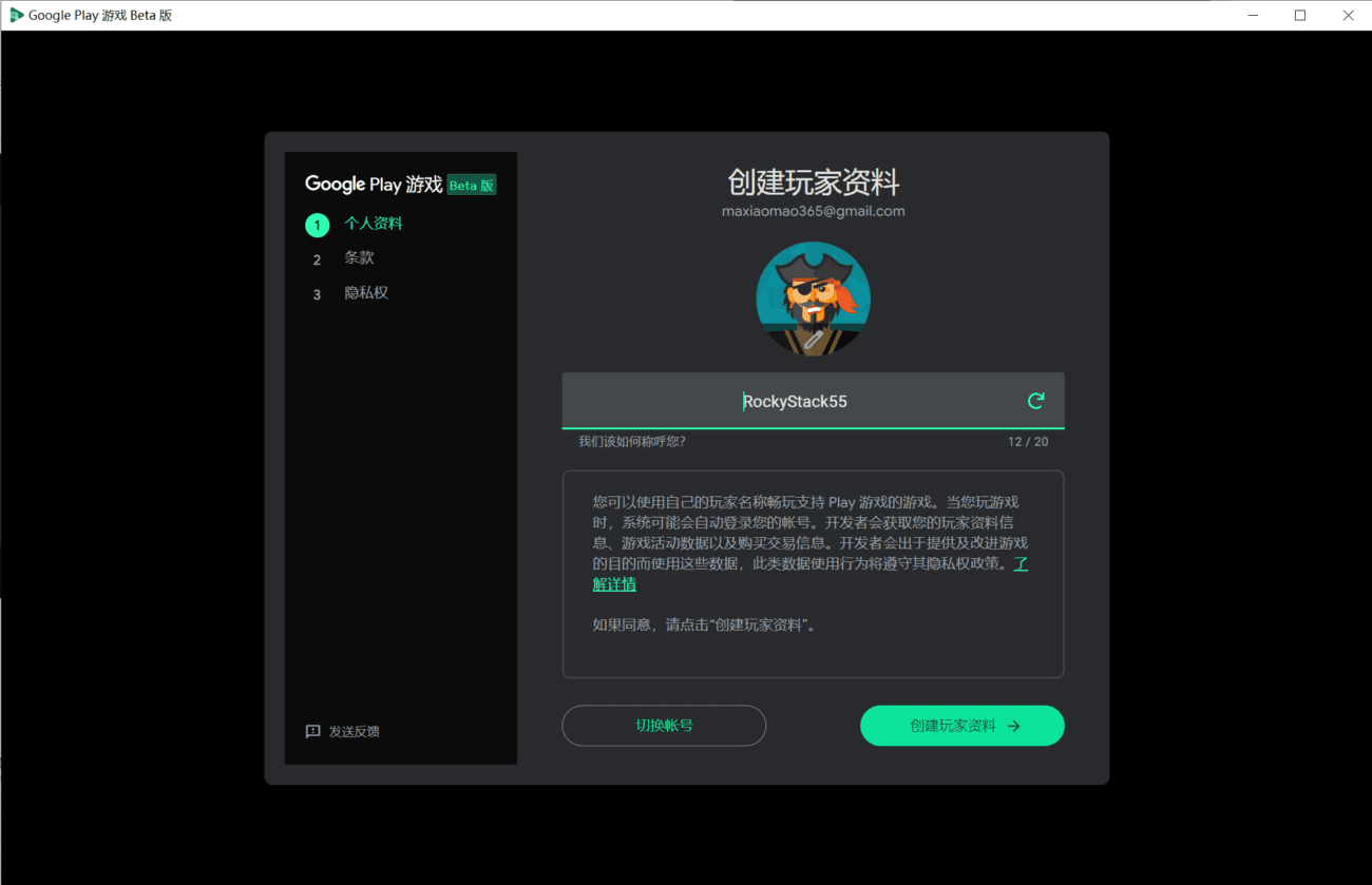 点击创建玩家资料,再确认一下条款,然后进入到 Google Play 游戏 界面!
