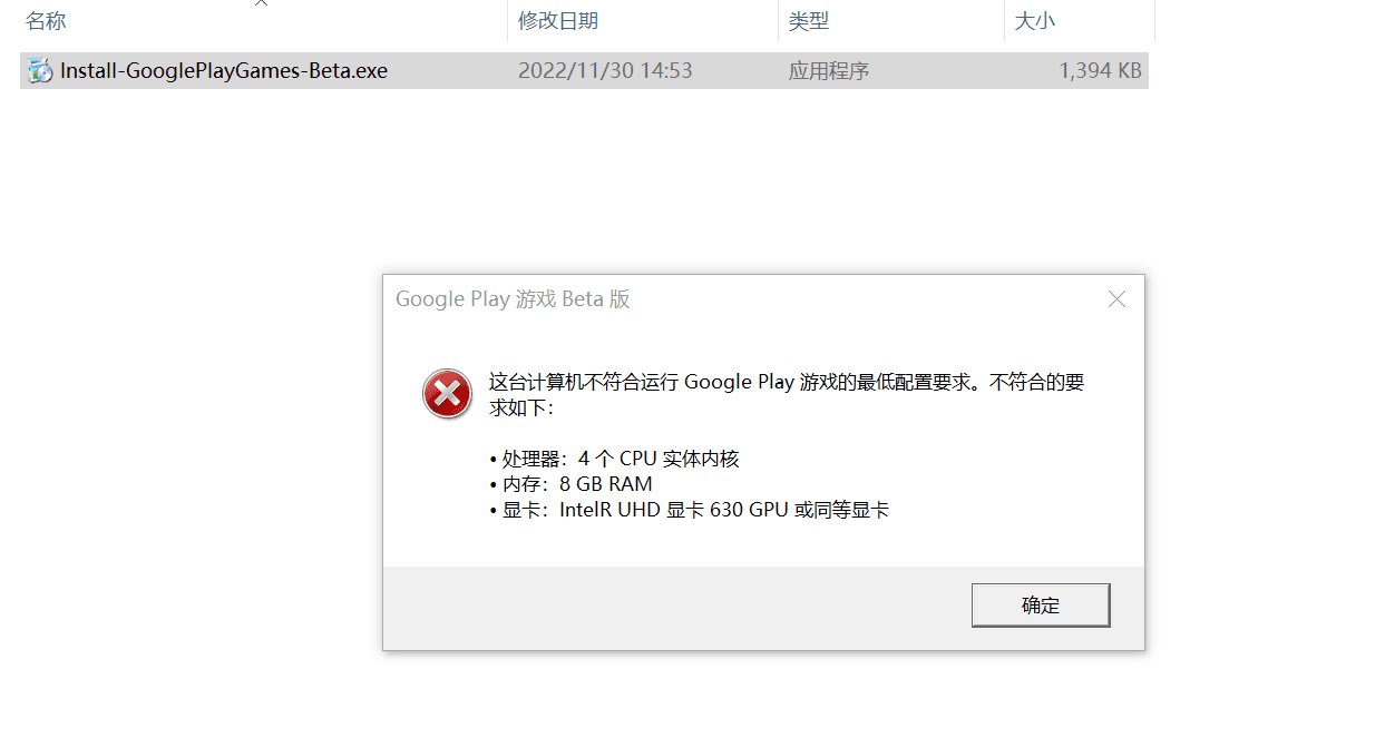虚拟机上测试安装失败,这软件对配置要求还挺挑剔的,cpu必须要大于或等于4个CPU实体内核,内存要大于8GB 。Google Play 游戏 无法在虚拟机上进行安装。