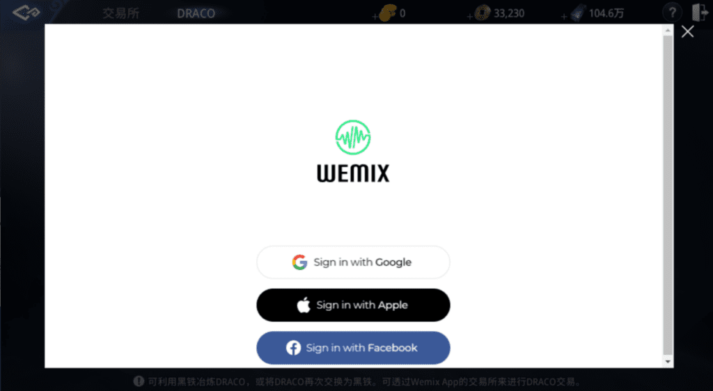 点击连接后,弹出Wemix Wallet的登录界面,使用你当前的游戏登录ID,注册登录Wemix Wallet。