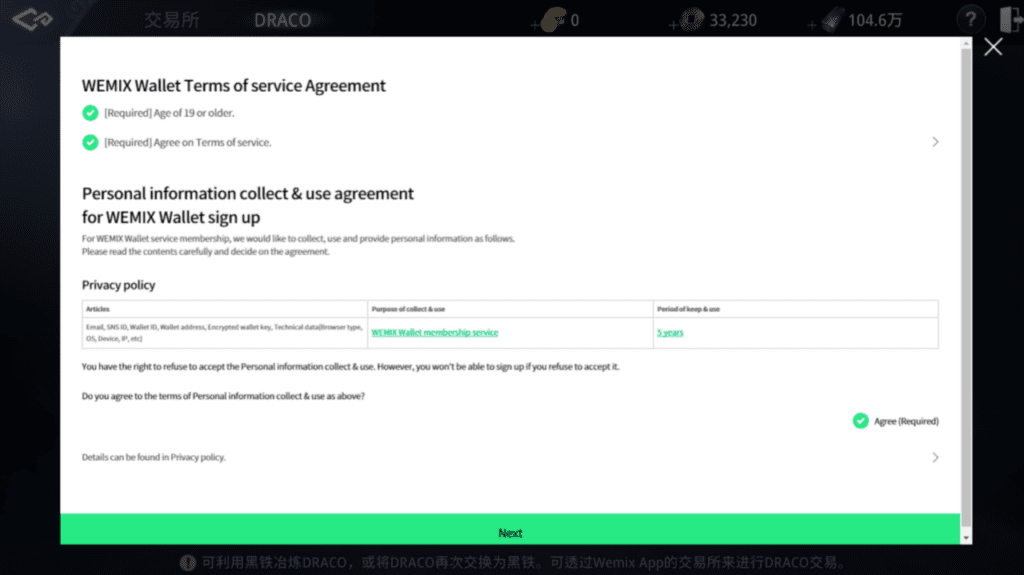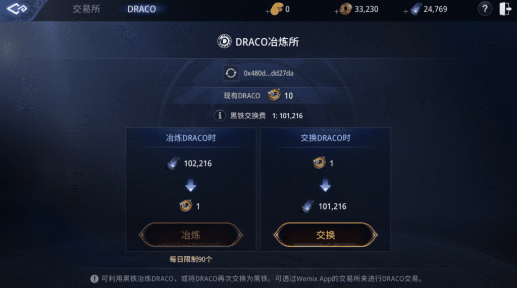 当前兑换一个DRACO需要102216块黑铁矿石。在首次兑换之前,你需要注册Wemix Wallet,什么是Wemix Wallet呢,Wemix Wallet是传奇4内部的一个线上交易平台。在这个交易平台上交换的代币就是DRACO。