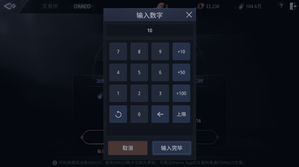 点击冶炼,弹出一个计算器,点击上限,这个是针对你账户里最大黑铁矿石数量计算出的DRACO数量。