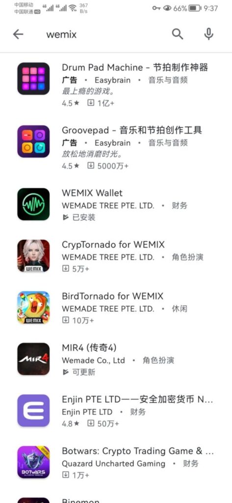 下面以Google play为例:在Google play中输入wemix,找到WEMIX Wallet的应用,图标是一个绿色电波的标志。