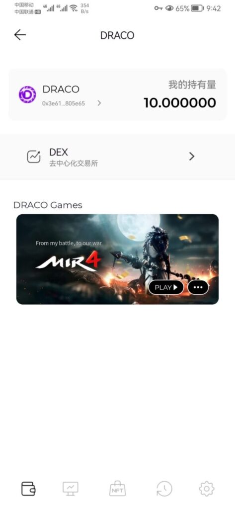在APP中可以看到WEMIX Wallet的APP和游戏中的WEMIX Wallet是同步的,你在游戏中兑换了多少的DRACO,在APP中就显示多少的DRACO。