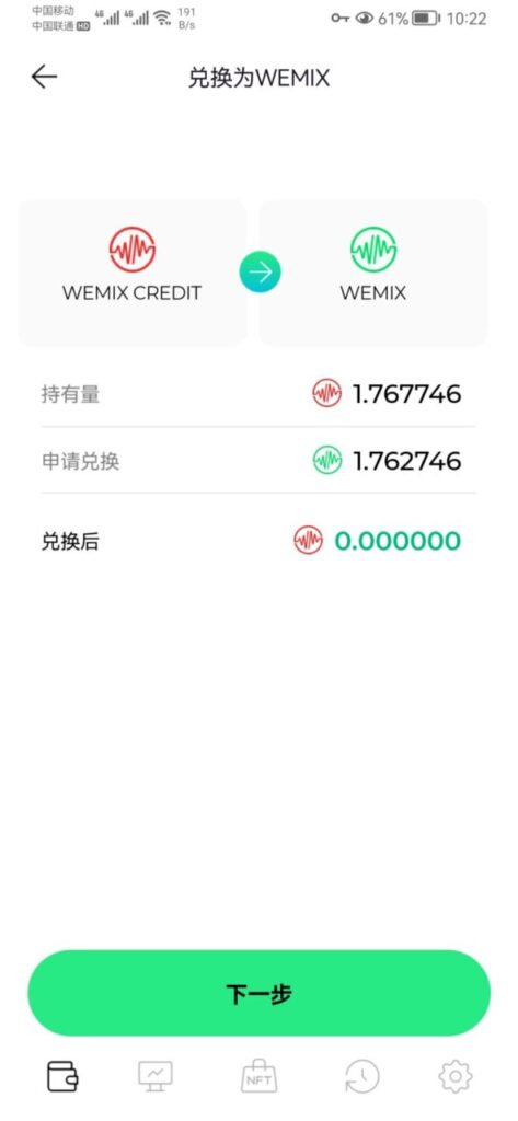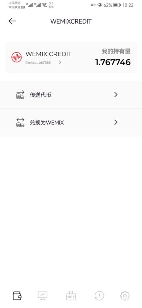 确认成功后,返回钱包页面,你会发现你的WEMIX CREDIT的数额产生了变化,这就是刚才使用一个DRACO兑换的1.767746个WEMIX CREDIT,别急,WEMIX CREDIT兑换完毕后,还需将WEMIX CREDIT兑换成WEMIX。