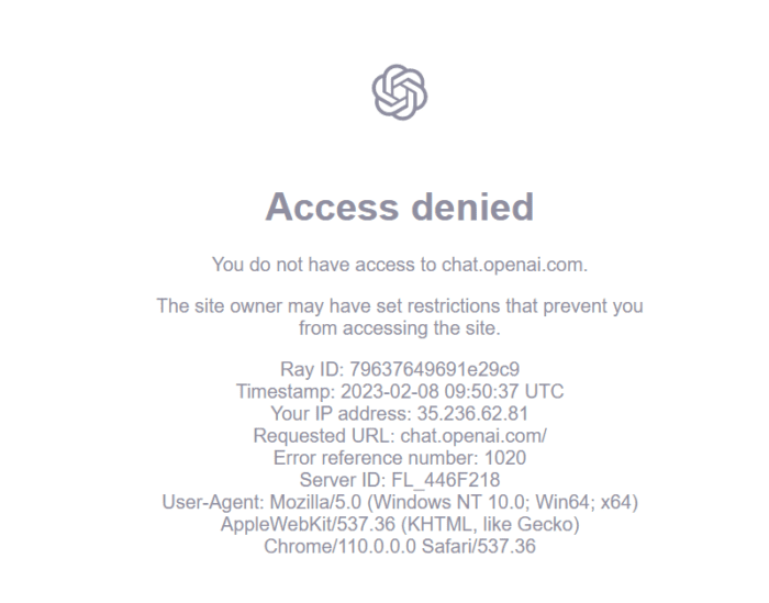 Access denied You do not have access to chat.openai.com. The site owner may have set restrictions that prevent you from accessing the site Access denied !不要问为什么会封锁国内用户,也不要问 Open AI 是如何识别出国内用户的,毕竟人家是做AI的,想封锁几个IP,那不是家常便饭。网上那些卖 ChatGPT 帐号的估计要哭了,薅了ChatGPT的羊毛难道要砸手里了?不要怕,下面教你如何解决 Access denied 的问题。