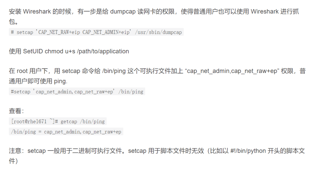 setcap 命令详解,在Linux中setcap命令最常见的就是限制1024以上的端口使用,也称为特权端口,可以不通过防火墙,进行端口限制。主要在于分割root用户的特权,即将root的特权分割成不同的能力,每种能力代表一定的特权操作。