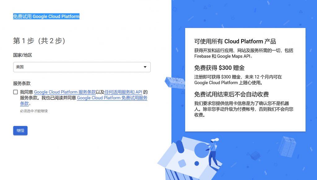 第一步是国家和地区这里选择美国,有人会问为什么要选择美国,你把国家/地区翻烂了你最多找到个中非共和国,Google服务的地区你懂的。勾选服务条款然后点击继续。