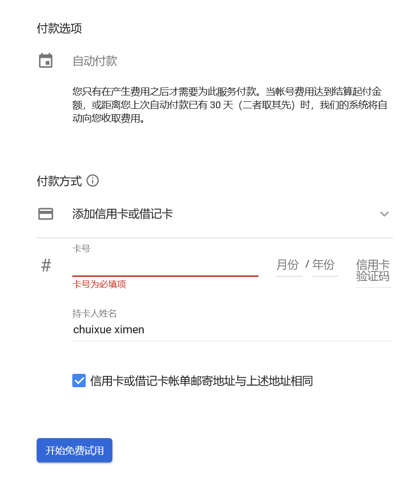 输入双币信用卡的卡号,和卡片上的有效日期,月份在前年份在后,卡片背面有一个信用卡验证码,这个验证码才是最重要的。Google这种大网站基本不会骗人,还可以放心填写,其它网站如果让你填写信用卡验证码一定要小心谨慎,信用卡验证码是信用卡背面刻在卡片上的后三位数字。输入完毕后,点击开始免费试用,恭喜你,你已经成功的申请谷歌云服务。