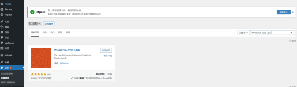 登录到WordPress网站的管理后台,在左侧列表中依次点击“插件”和“安装插件”。在插件搜索框中输入“WPAdmin AWS CDN”;点击对应的“立即安装”按钮: