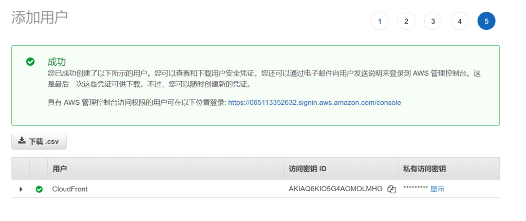 这里列出了访问密钥ID和私有访问密钥这两个非常关键的信息。请记录这两个信息。并且需要注意保密,任何人知道这两个信息后,都将可以使用你的CloudFront服务。
