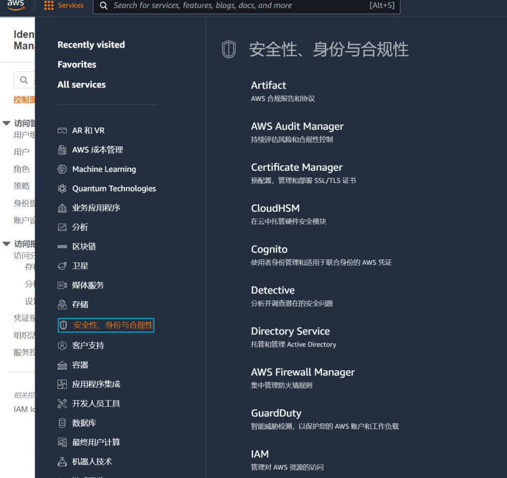 点击AWS控制台左上角的“Services”,点击“安全性、身份与合规性”,之后点击“IAM”。