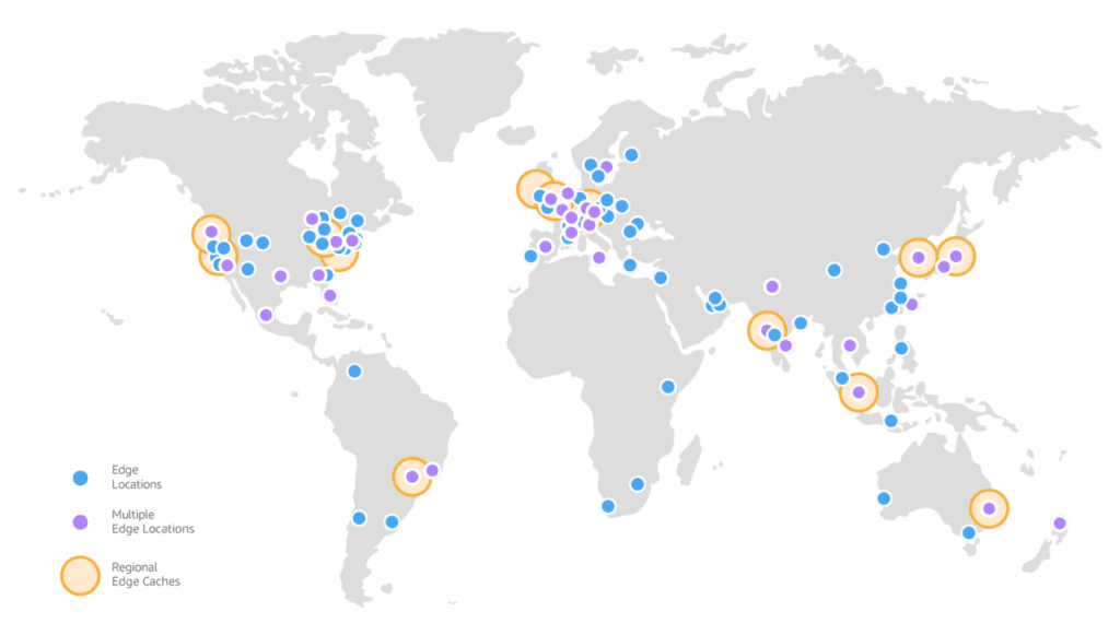 为了以更低的延迟向终端用户提供内容,Amazon CloudFront 使用了一个包含超过 410 个节点(超过 400 个边缘站点和 13 个区域性边缘缓存)的全球网络,该网络覆盖 47 个国家/地区的 90 余个城市。