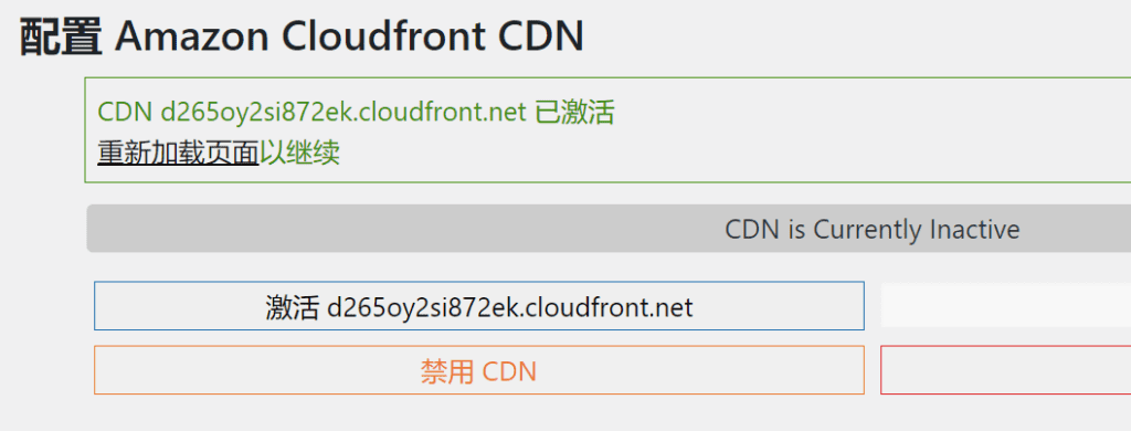 最后点击“Create Distribution”后,稍等片刻该页面会显示已成功创建CloudFront分配,随后点击“Reload the page”链接,可以看到左侧显示出了已分配的CloudFront二级域名,点击该域名对应的“Active”按钮。