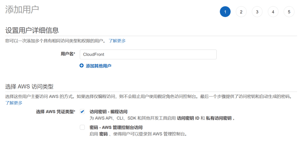点击访问管理中的用户,点击添加用户。用户名填写 CloudFront ,选择AWS凭证类型,勾选访问密钥-编程访问。之后点击“下一步:权限”。