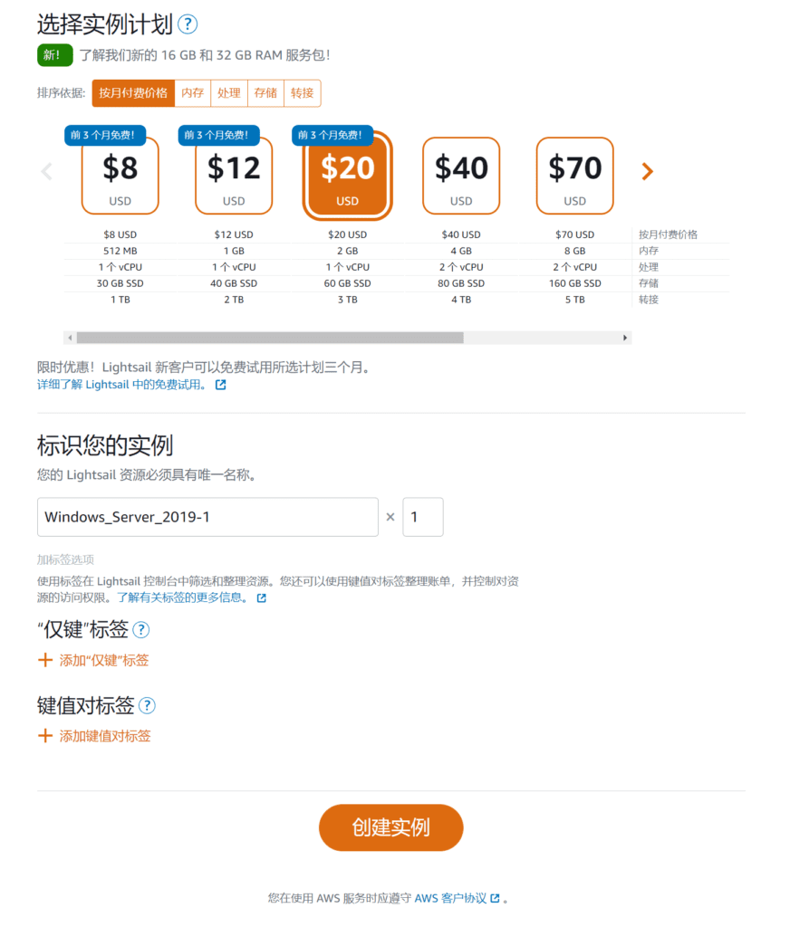 - 选择实例计划:配置和付费计划,同样是免费三个月,当然是选择配置最高的了,每月20美元,2G内存,1核CPU,60G的SSD硬盘,每月3TB流量;