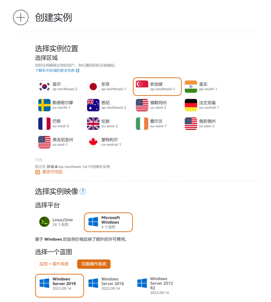 点击立即创建实例后,在创建实例的界面中,自上而下,可以选择配置: