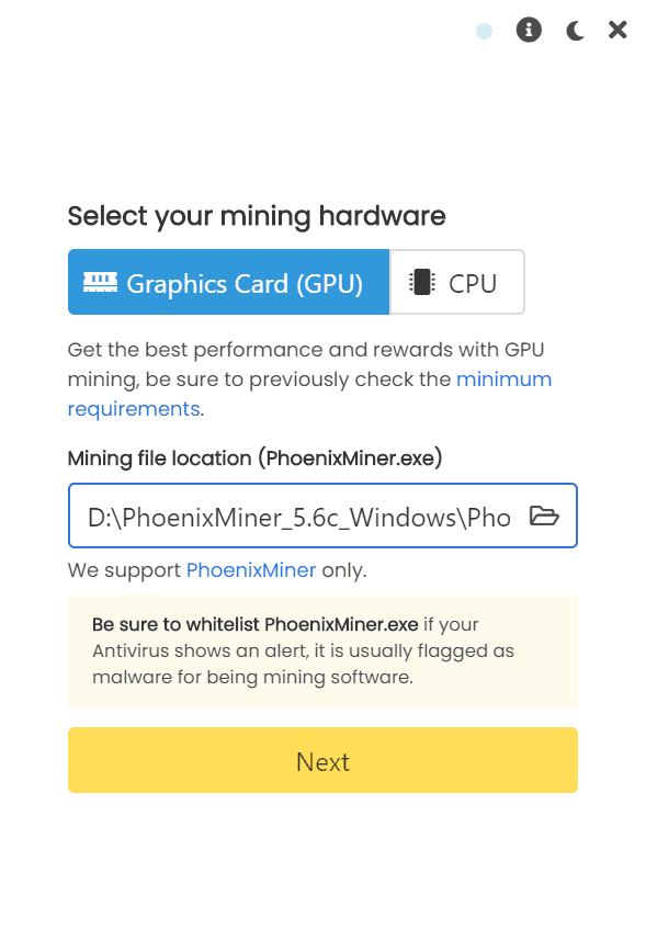 选择好PhoenixMiner.exe所在文件目录后,点击Next进入下一步。