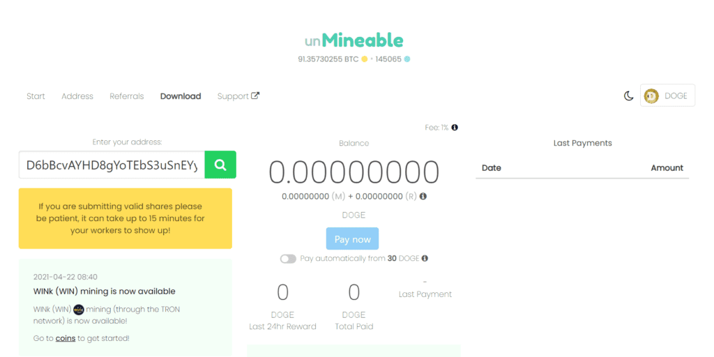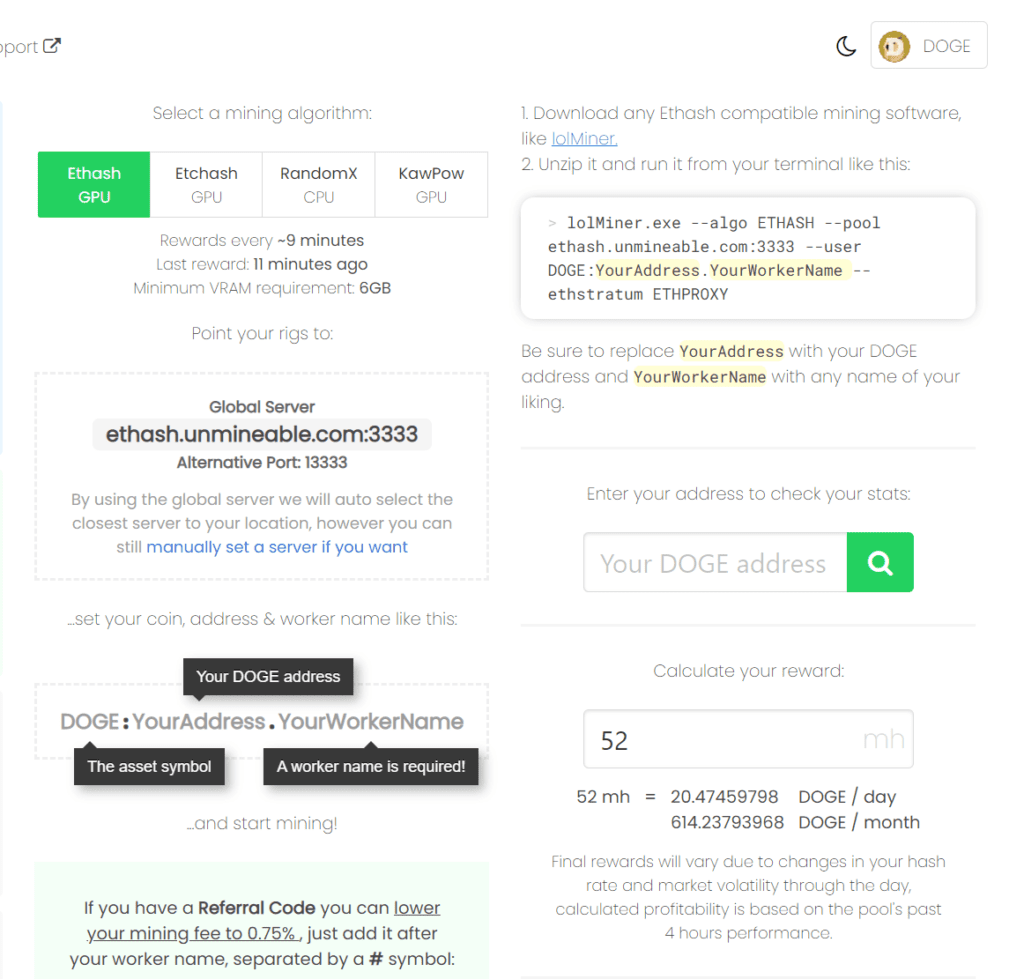 支持的算法: Ethash,Etchash,RandomX和KawPow。所有硬币收取1%的采矿费,使用unMineable的推荐系统,可以获得被动奖励并降低0.25%的转账费用!