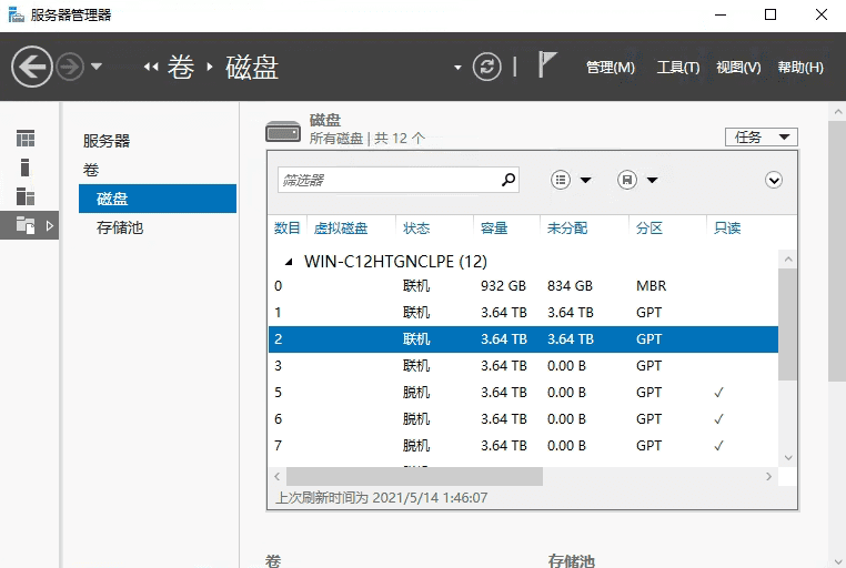 重新启动后,开始配置硬盘,在刚才的服务器管理器中点击存储池。