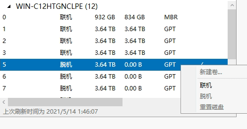 点击右键,联机,将所有脱机的磁盘联机。在联机过程中可能会弹出需要格式化的窗口,点击取消即可。