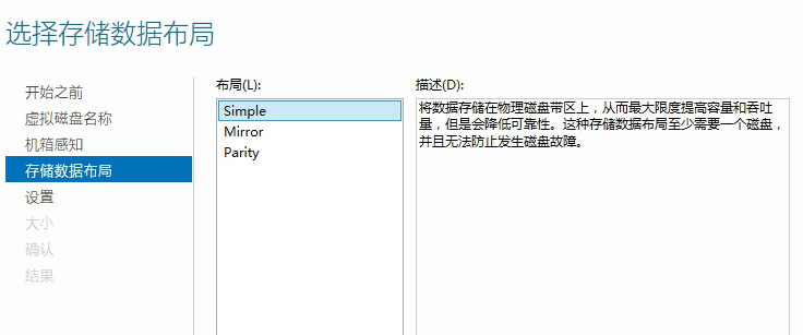 在存储数据布局选项中有三个可选项,simple,mirror,parity。