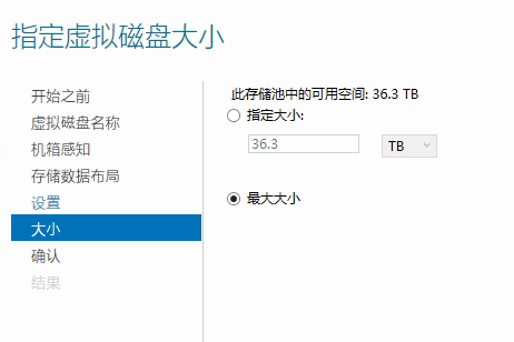 指定虚拟磁盘大小选择最大大小后,点击下一步创建虚拟磁盘。完成后点击关闭按钮。