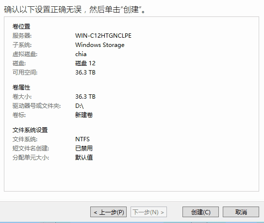 指定卷大小,默认即可,驱动器号或文件夹,默认下一步,文件系统设置默认下一步。之后点击创建。