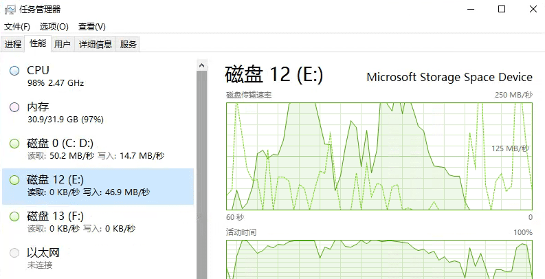 之后打开任务管理器,就可以查看到磁盘的实时读写数据了。