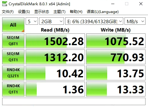 在ALL后面的“5”是测试读写次数,默认即可,“1GiB”是测试读写文件的大小。后面的是需要测试哪一个硬盘,测试D盘就选择D,测试C盘就选择C,默认是C盘。“MB/s”是测试写入数据的单位。