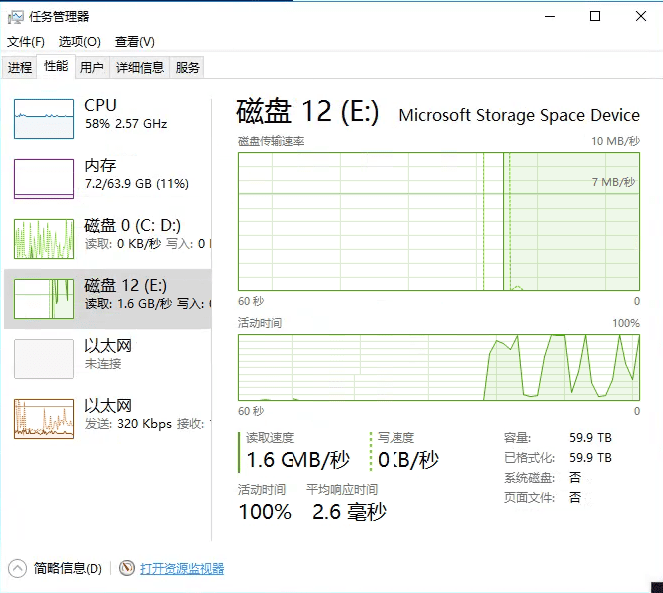 CrystalDiskMark测试期间可以打开任务管理器查看硬盘的读写状态。