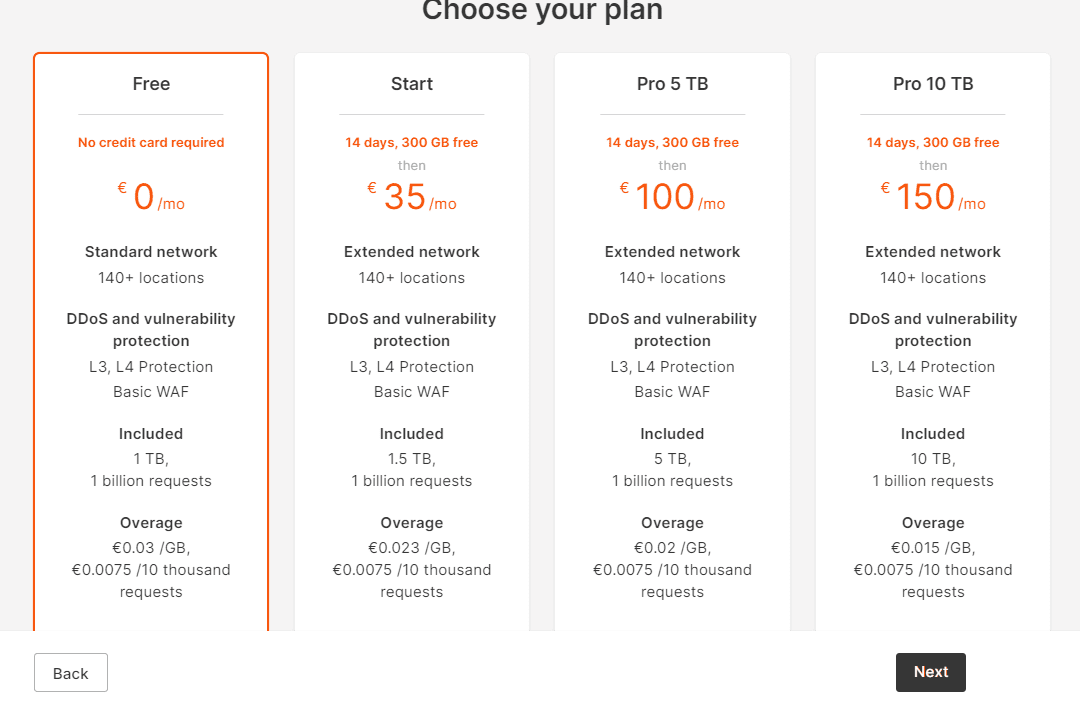 免费CDN 服务当然要选择免费的FREE,默认选择 0/mo 然后点击 Next 激活CDN模块。