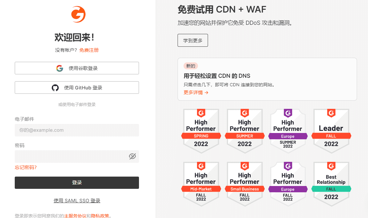免费CDN 的注册还是比较简单的,使用你的Google帐号或者是GitHub的帐号都可以直接登录,或者使用你的电子邮箱注册。
