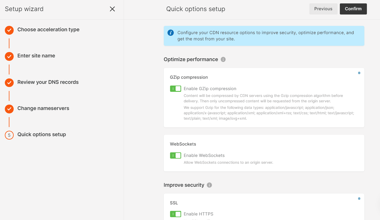 配置您的 CDN 资源选项以提高安全性、优化性能并充分利用您的站点。