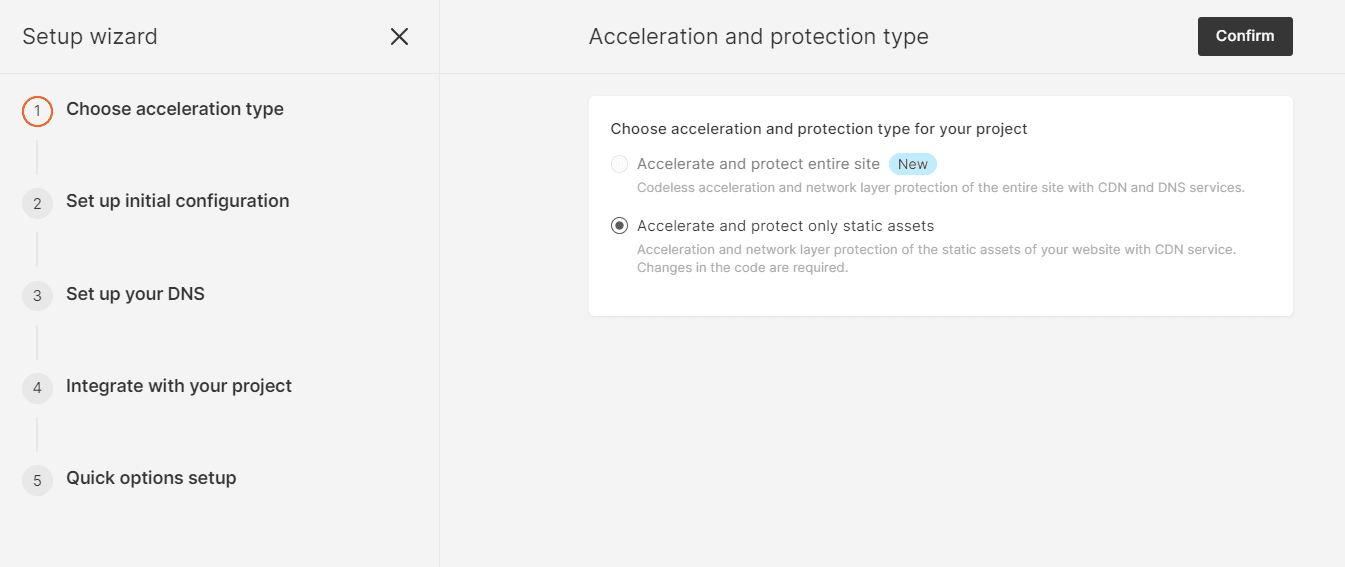 为您的项目选择加速和保护类型:默认选择加速和保护整个站点,使用CDN和DNS服务对整个站点进行无代码加速和网络层保护。免费计划会自动激活 DNS 服务。