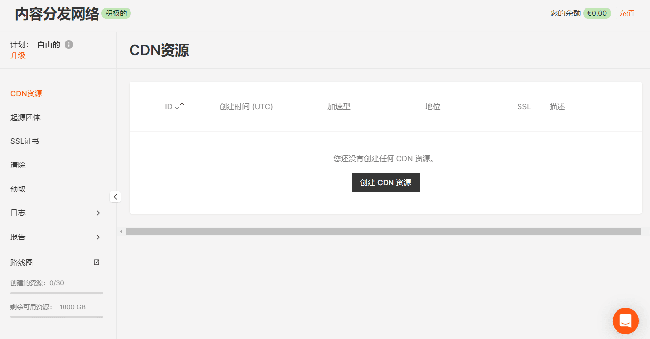 CDN模块激活后,需要新建一个CDN资源,在左下角我们可以看到,免费资源剩余1000G,也就是免费的1T资源流量。
