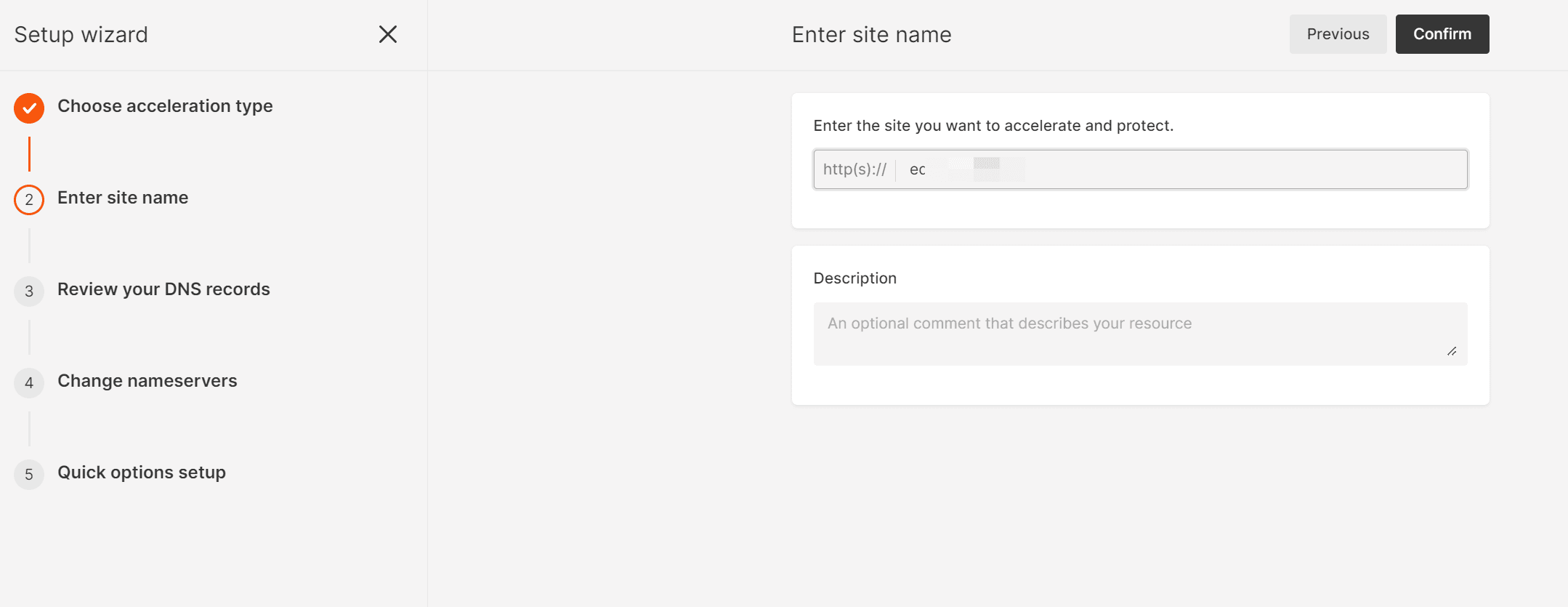 输入您要加速和保护的站点:将你的网站域名输入进去,无需填写网站描述。