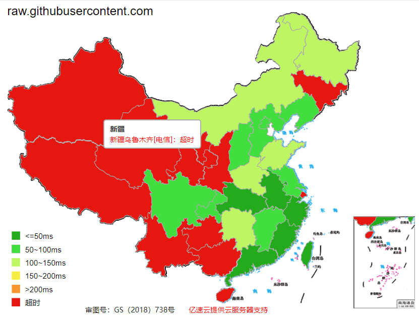 以上截图来自 ping.chinaz.com 的域名检测,红色区是无法访问的地区,如果访问raw.githubusercontent.com 域名呢?下面在网络上找到了办法。