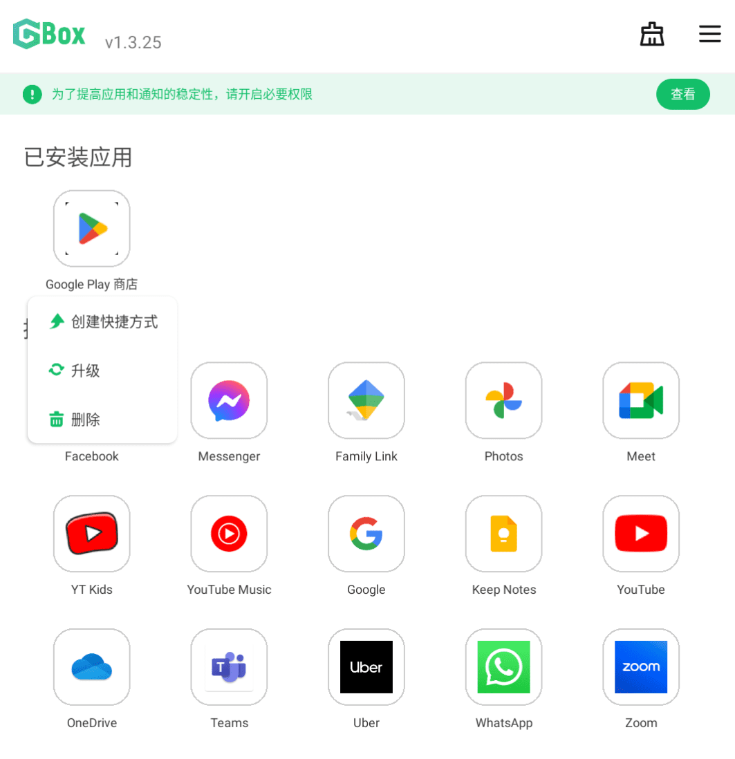 在GBox中,按住已安装的应用图标,下面会弹出菜单,将安装的应用创建快捷方式,这样,你就可以在手机桌面上启动这些应用了,是不是很简单!