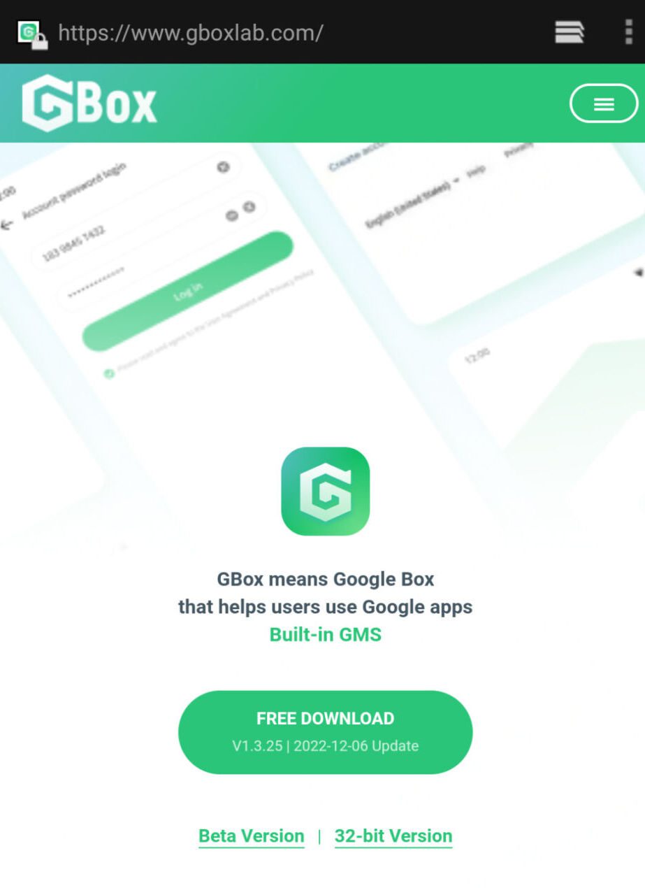 在手机浏览器内输入https://www.gboxlab.com/ 然后点击 FREE DOWNLOAD 下载最新版本的GBox应用并安装GBox。