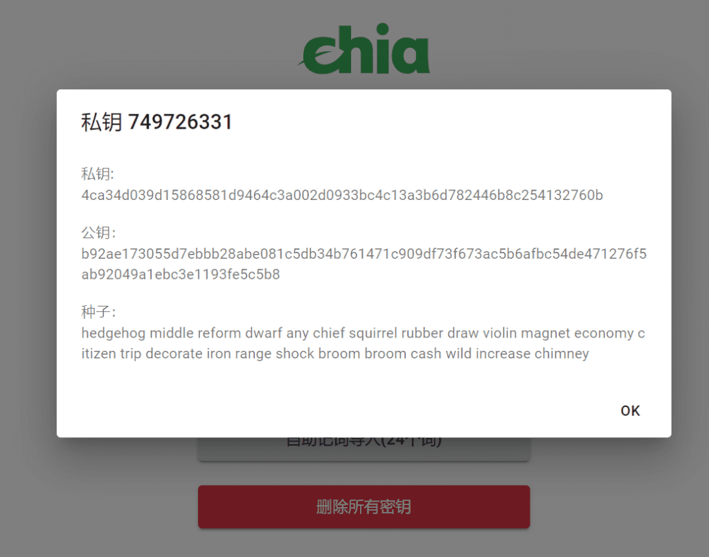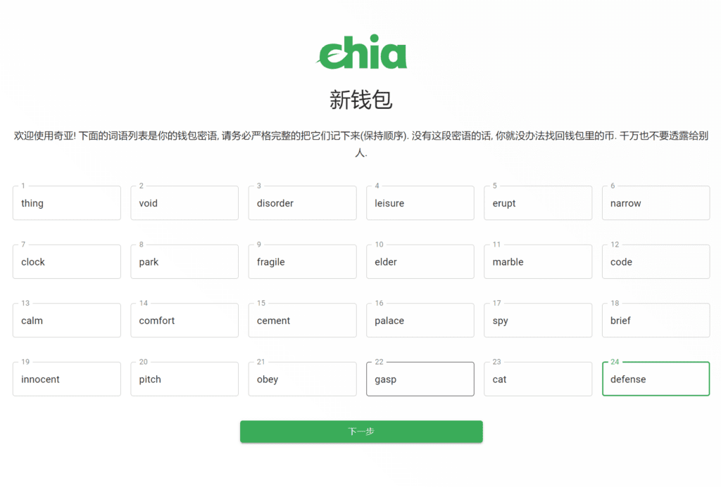 将你钱包的24个助记词复制粘贴到“输入你的脑密码”里面,Chia钱包的助记词在钱包界面左下方的密钥里获取。
