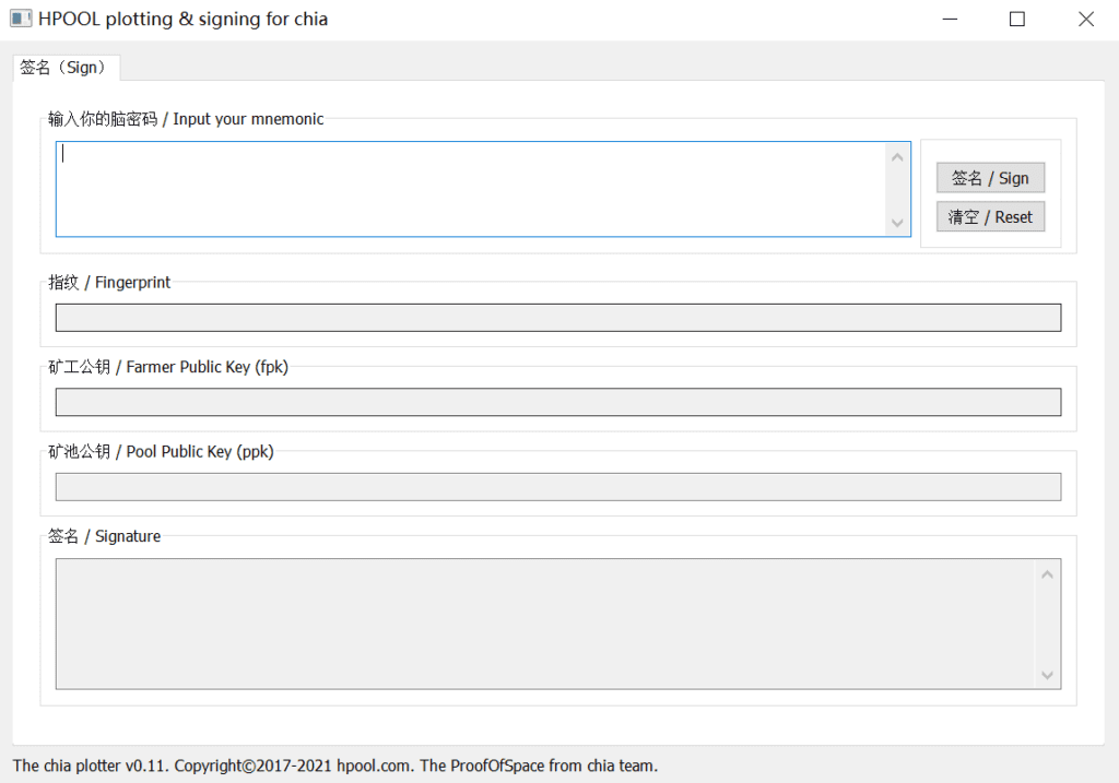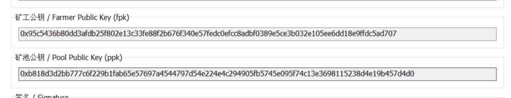 返回到刚才的签名工具中,获取矿工公钥farmkey及矿池公钥poolkey。