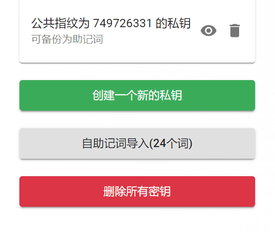 点击公共指纹为XXXX的私钥后面的小眼睛,就可以看到24个助记词。