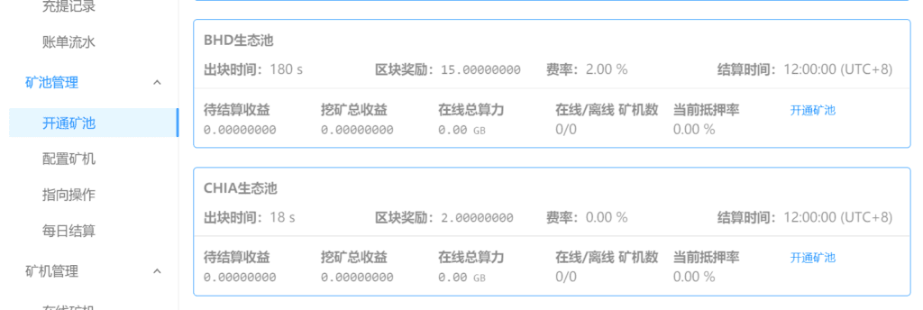 点击激活链接后成功登录到矿池,然后在个人中心的开通矿池页面,单击“全部”找到“ CHIA生态池”点击开通矿池。