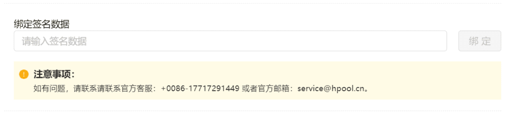 注意:算力签名和绑定矿池,只需用到算力签名数据,矿池不会获取用户的私钥和助记词,并且算力签名软件是可以在无网络状态下生成绑定数据的,绝对安全,请放心使用!