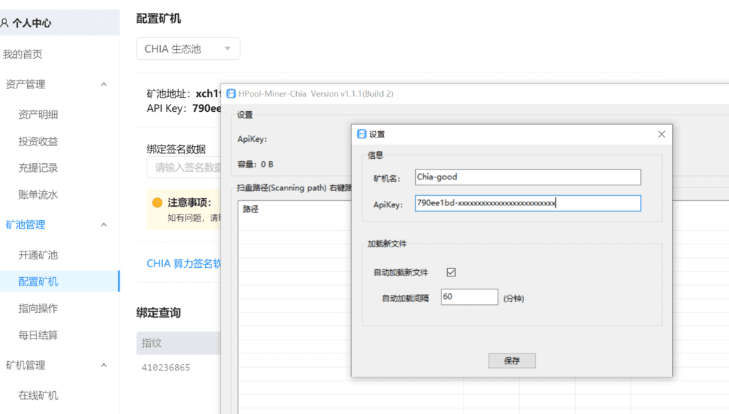 打开Hpool-miner-chia后,点击设置,输入ApiKey,ApiKey是在hpool.com网站的矿池管理的配置矿机页面获取。勾选自动加载文件,勾选之后,P好的盘可以自动加载到Hpool-miner-chia进行挖矿。
