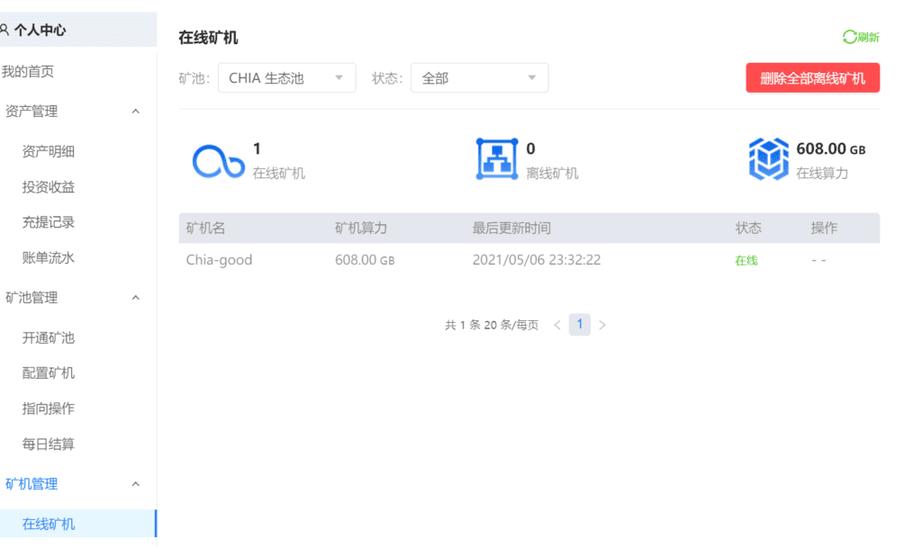 在矿池网站hpool.com的个人中心里,查看矿机管理中的在线矿机,刚才配置的挖矿软件已经生效了。